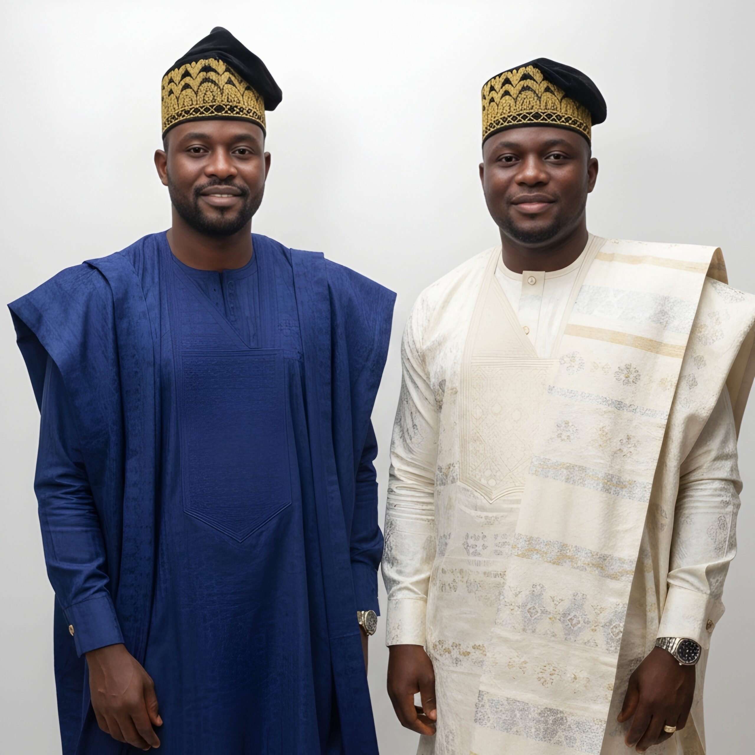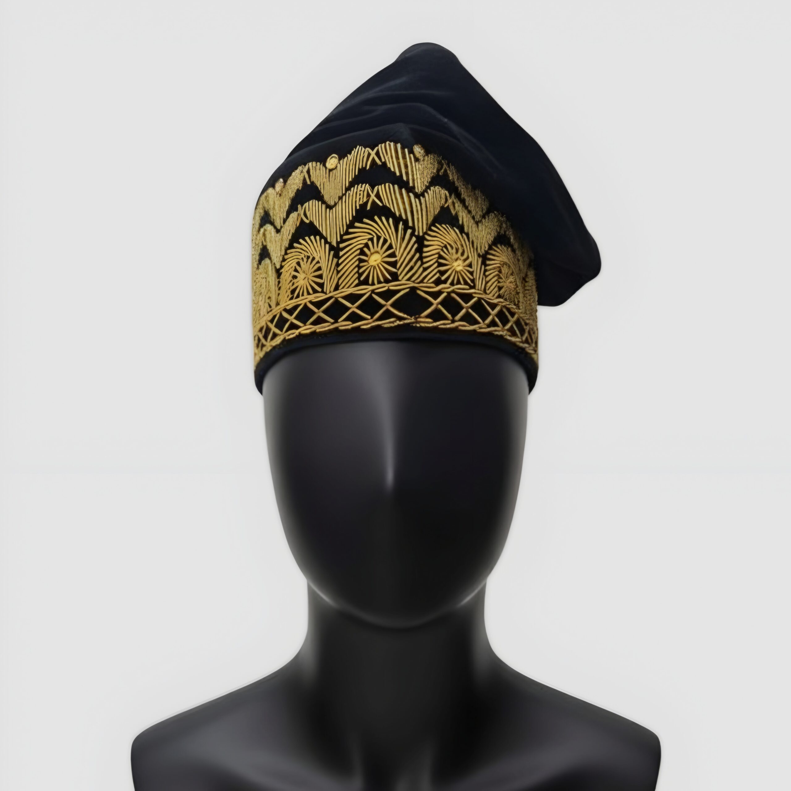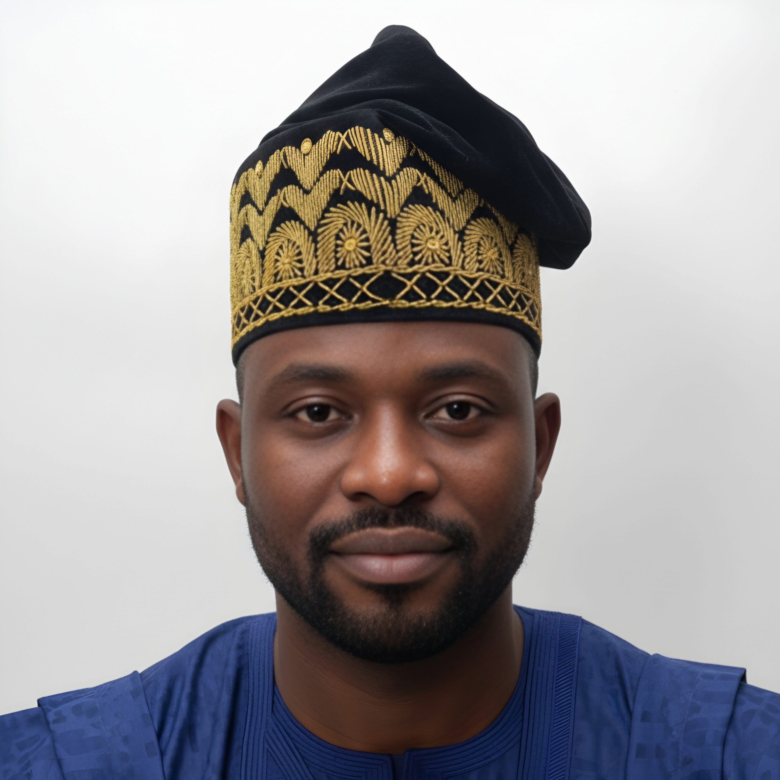 Command respect at your next event with the Gilded Wave Fila. This cap features thick, high-density gold embroidery that creates a textured, architectural feel against the deep black velvet base. The geometric wave pattern is a nod to traditional Yoruba craftsmanship, symbolizing flow and prestige. Its structured yet flexible build ensures it maintains its shape whether you choose to fold it to the left, right, or front. A premier choice for grooms, fathers of the day, or distinguished guests.